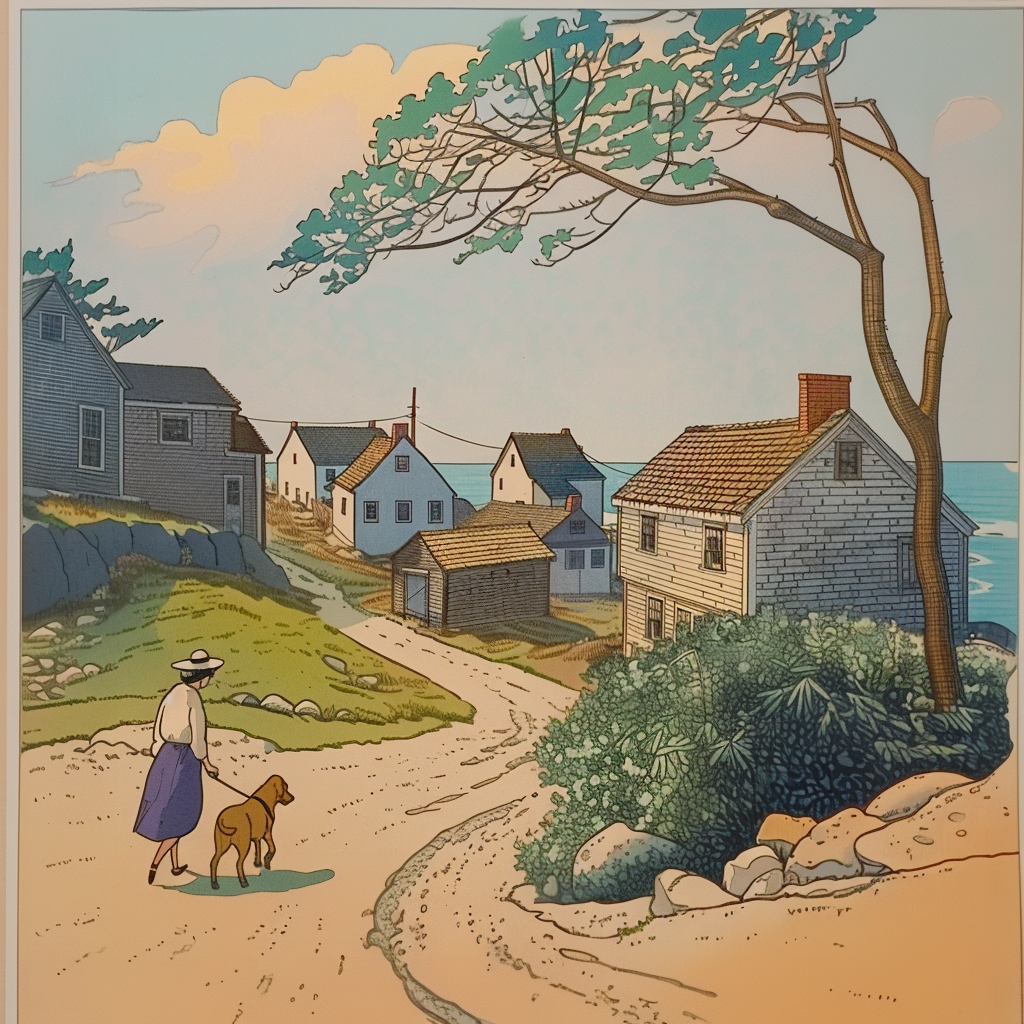 Beach Butterflies Woodblock-inspired scene with wildflowers | Coastal Vintage Digital Download Art